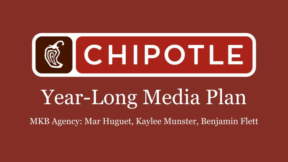 In this project, we were tasked with developing a comprehensive, year-long media plan for Chipotle, utilizing a $100 million budget. Our strategy focused on selecting media channels and partnerships that aligned with Chipotle’s brand values and resonated with its target audience of health-conscious millennials and Gen Z consumers.